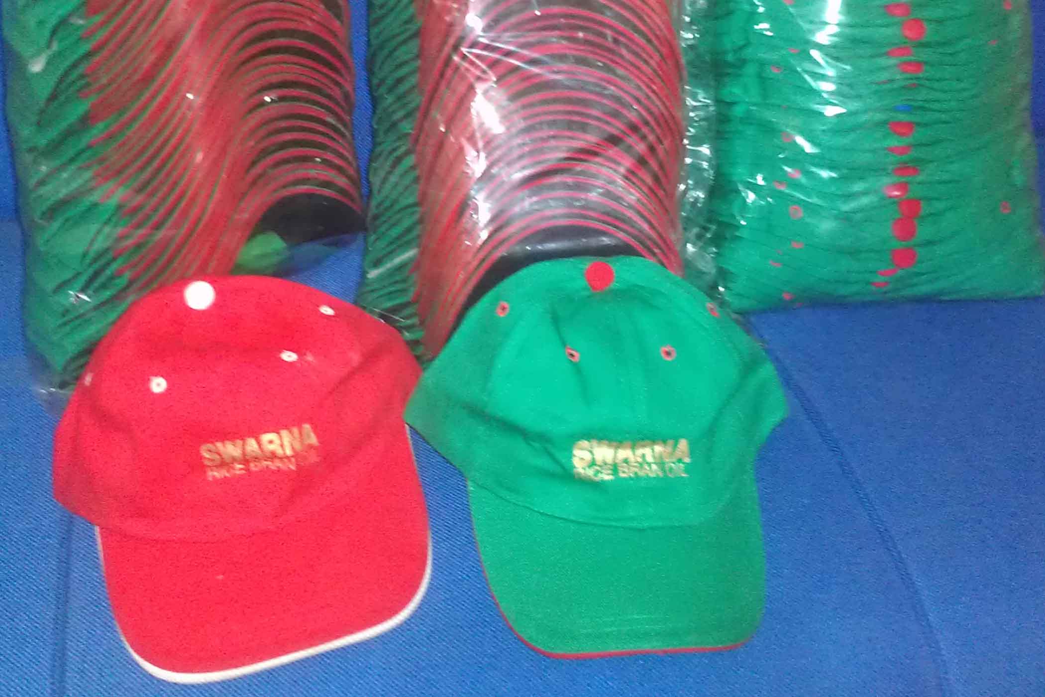 Cap for SWARNA: We made this cap to promote SWARNA Rice Bran Oil. Art Impel not only prints this cap, but also we can provide any color fabric for your company. Quantity is not a matter but the minimum quantity would be 500 pcs. we are dedicated to serving you the best service.